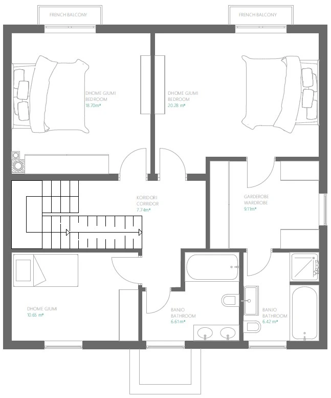 Kati i parë: Dhoma e madhe e gjumit me dush en-suite dhe gardërobë, 2 dhoma gjumi dyshe, banjo të veçantë.