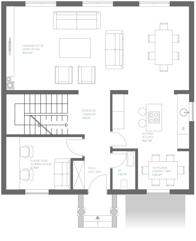 Kati përdhesë përfshinë: dhomën e qëndrimit me kuzhinë & tryezarinë, dyer françeze dyshe që të çojnë drejt kopshtit prapa.